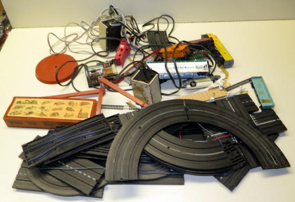played with, apple box full of trains, track and parts, all to go