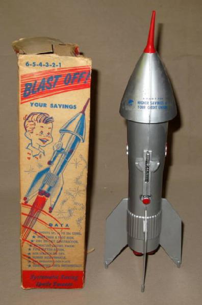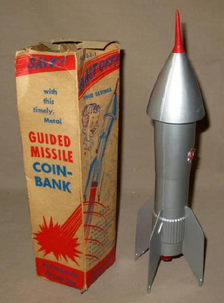 13" tall, very nice bank that shoot the coin up the side and lands inside the bank, box is a little rough, but still neat