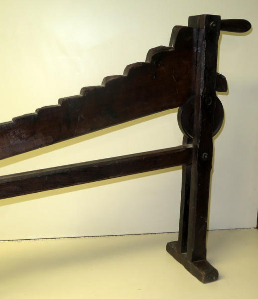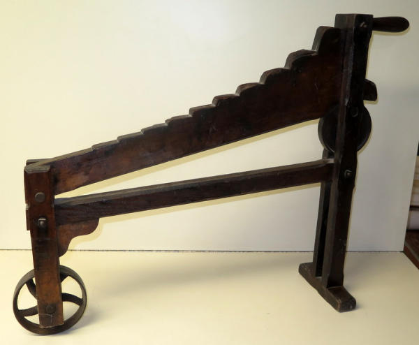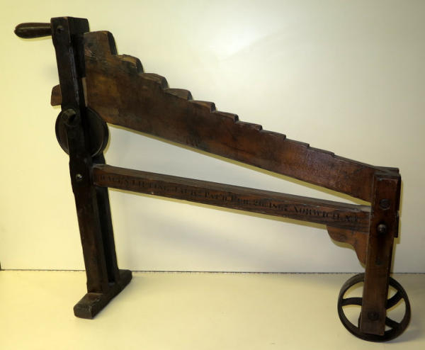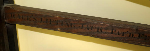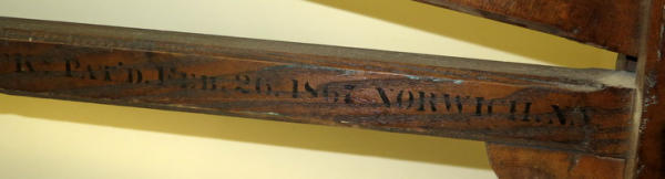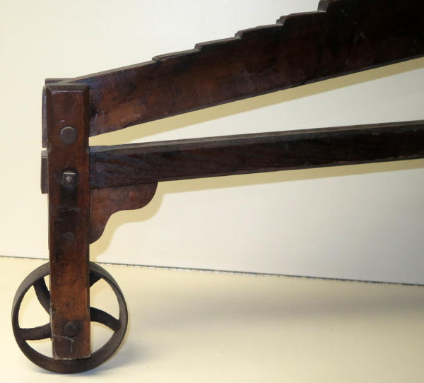 has the stenciling on the side, unique piece, 27" tall, 30" long, mostly wood with 2 iron wheels