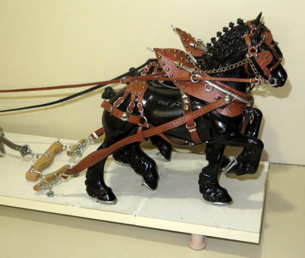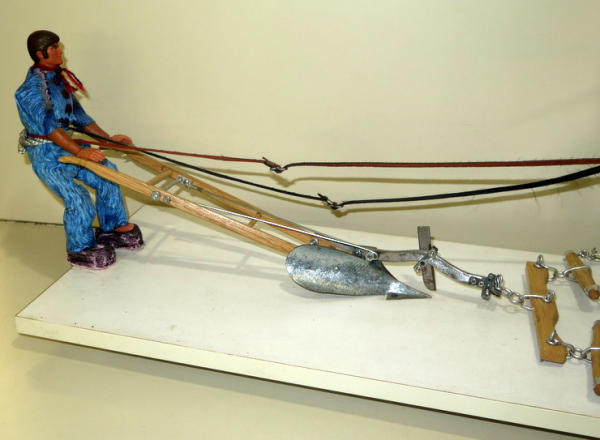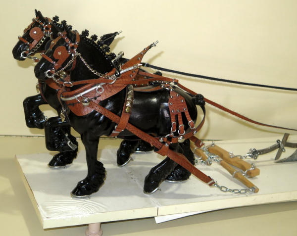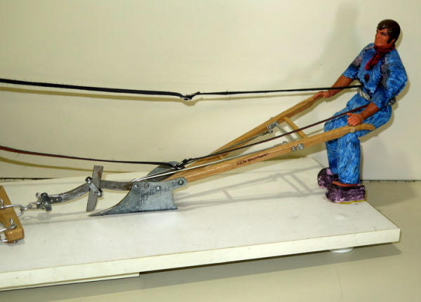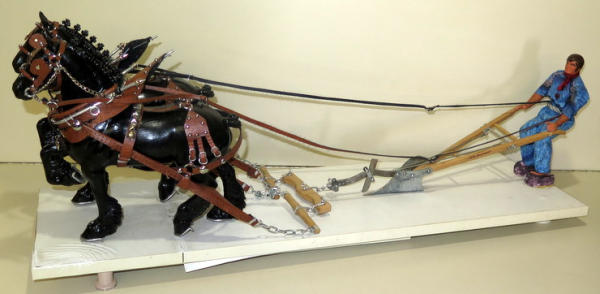 all mounted to a board, about the size of a Breyer horse, full leather harness, handmade plow, Guy is an old GI Joe figurine, good looking set