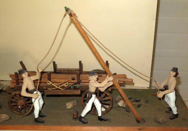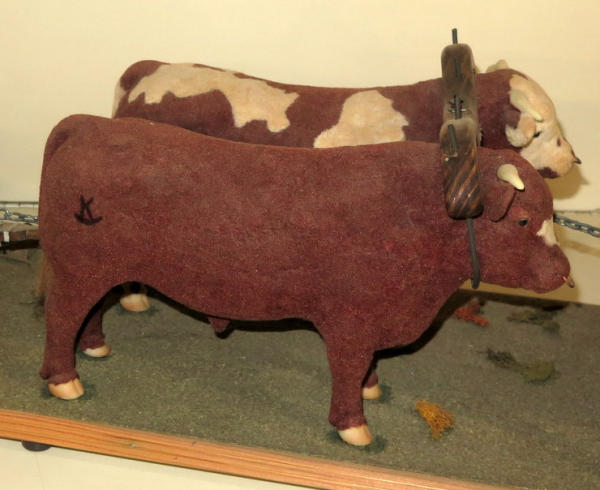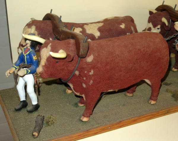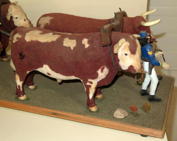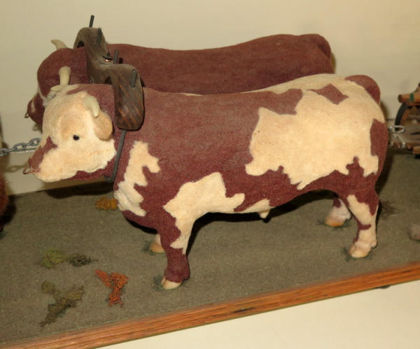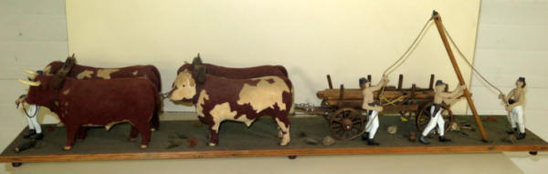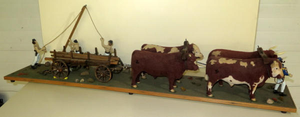 almost 5' long! Ox are Breyer's that have been custom flocked & colored, cart is hand made, men are carved, very unique set; no shipping, local pickup only