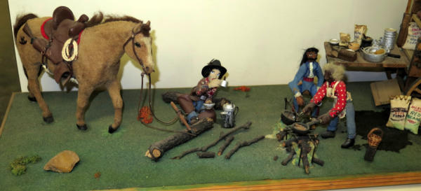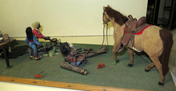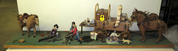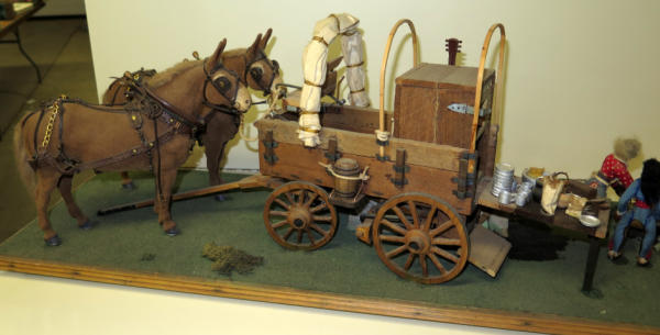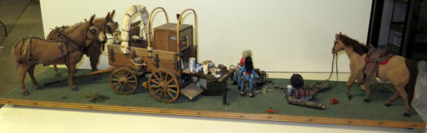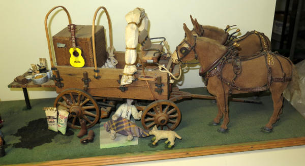 2 Custom flocked Mules, Custom flocked horse, 4 carved people and hand made wagon, about 4' long, unique, no shipping