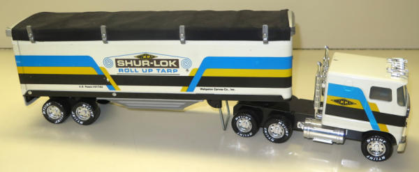 Made by Nylint for Shur-Lock; 1/25th scale, small chip on the back of the cab, has real roll-up tarp, nice piece