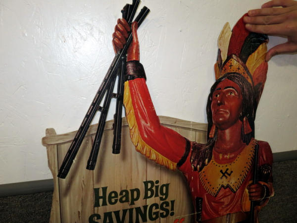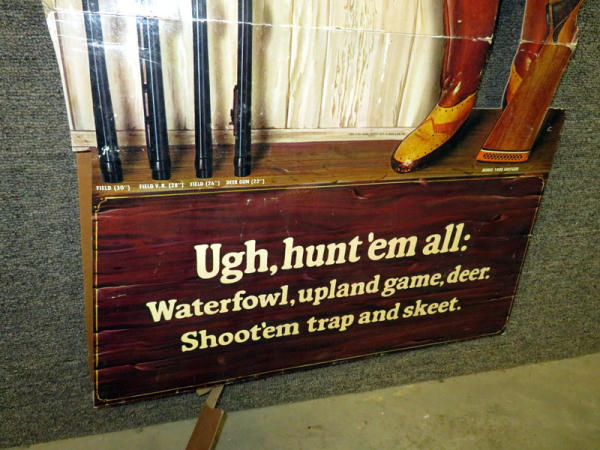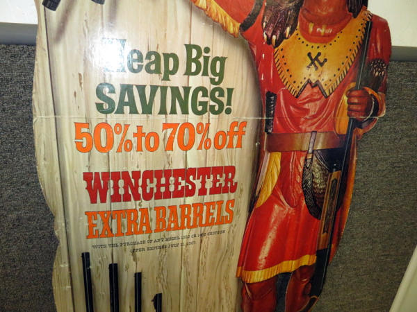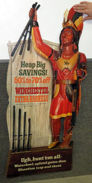 WOW, great piece of Winchester advertising! Nearly 60" tall! Has some damage to the edges; all cardboard; has been folded; shows a Winchester Mdl. 1400 shotgun being held in the Chief's hand. Great piece for the Winchester or just advertising collector to display!