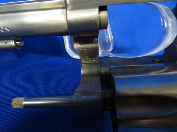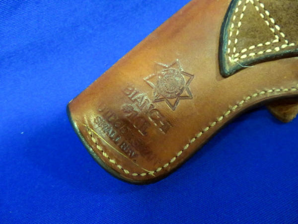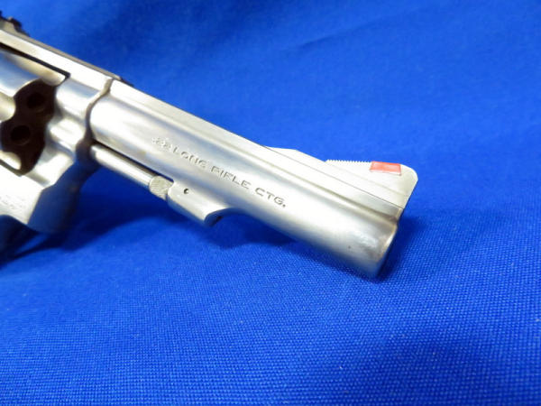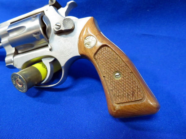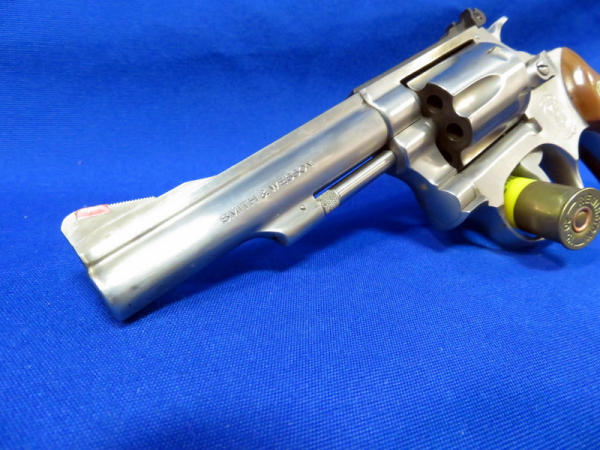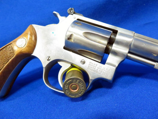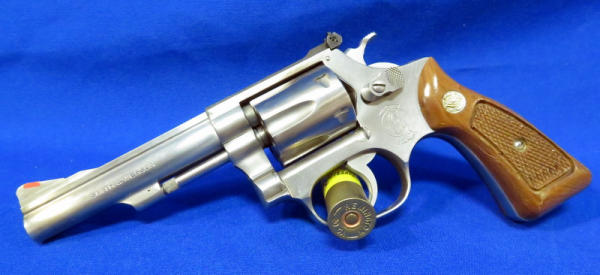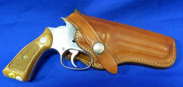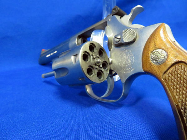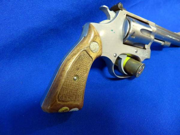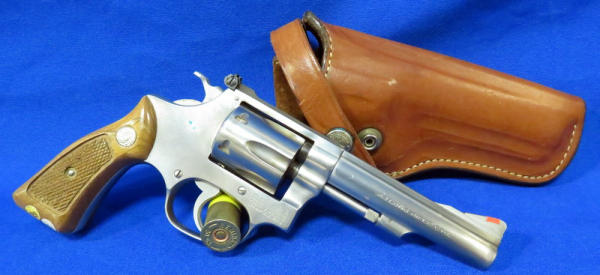 4" stainless ribbed barrel; red ramp front sight; DA; factory wood checkered grips; very nice condition; comes w/Bianchi #10L leather belt holster; SN#M221546