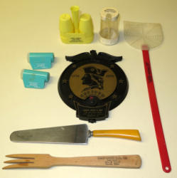 #895 - Box Lot of JD Advertising items--Flyswatter, S&P Shakers, Utensils & more