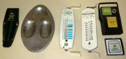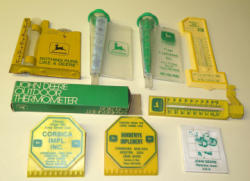 #942 - Lot of JD Dealer Advertising--Thermometers, Tape Measure, Pliers holder & more