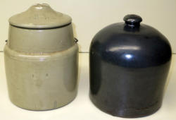 #909 - (2x) Stoneware Items--Zinc Glaze Chicken Waterer? And 1-gallon lidded jar