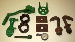 #892 - Box Lot of JD Cast Iron Items--Painted D&M Corn Planter lid and VanBrunt-Horicon Handles