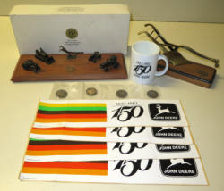#929 - Box Lot of JD 150th Anniv. Memorabilia--Walking Plow, Desk Set, Bumper Stickers, Mug & Medallions