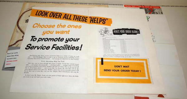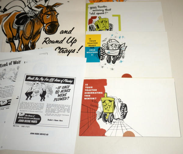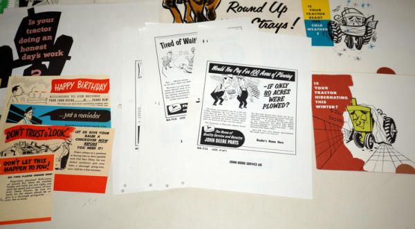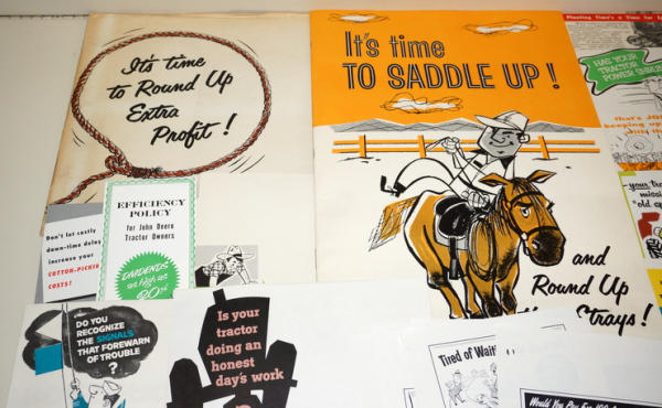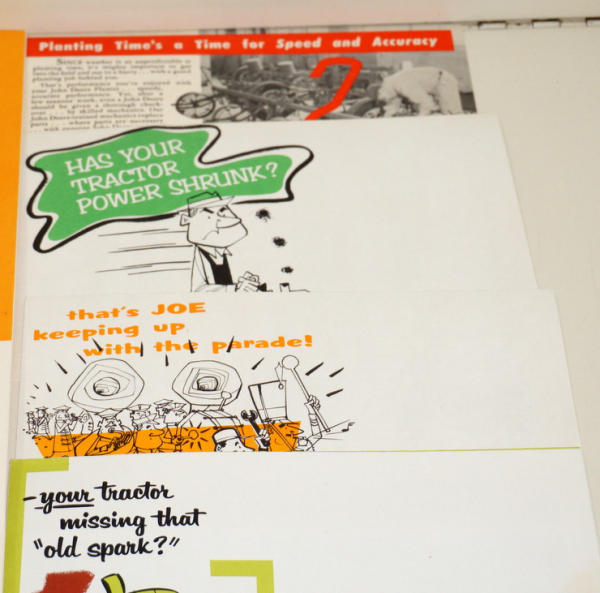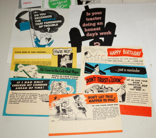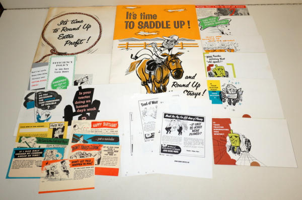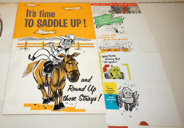 Large graphic folder, 18"x12", original envelope; full of over a dozen examples of mini-size mailer brochures for the dealer to choose from (cotton pickers, Winterizing, & more), envelope has some general wear, but contents are A-1; probably a 1-of-akind find!