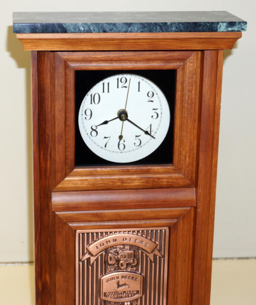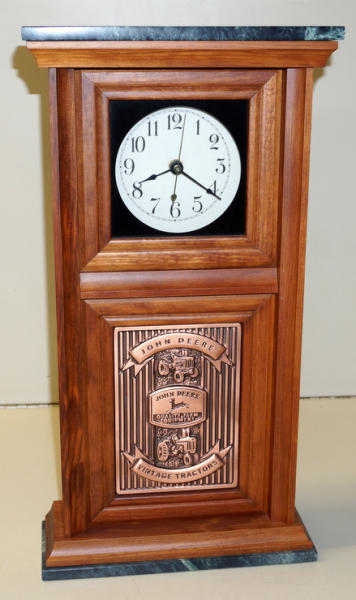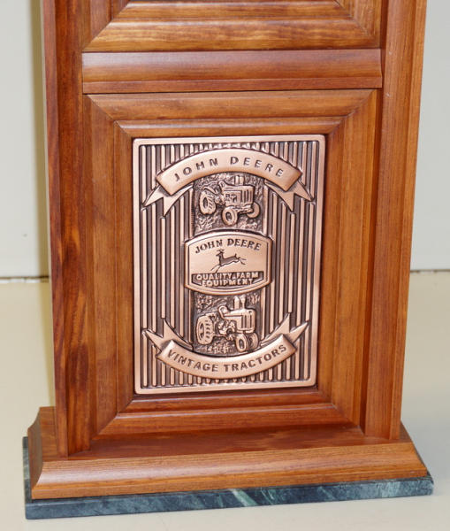 18" tall, 9.5" wide, wood with marble base & top, copper plate w/ logo and tractors; very nice, high-quality piece