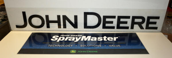 modern plastic signs from display, smaller one is about 33"x11", some wear, 2x the money