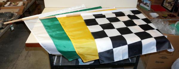 Don't know the story behind these, but they are real race flags, no logo, but the Green & Yellow are obviously JD Green, all to go for one bid
