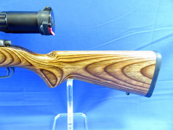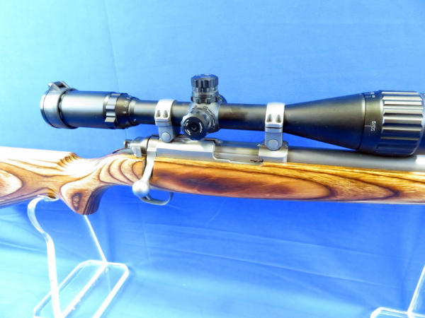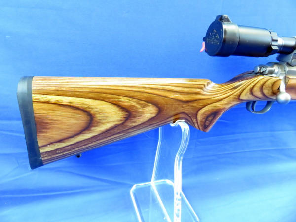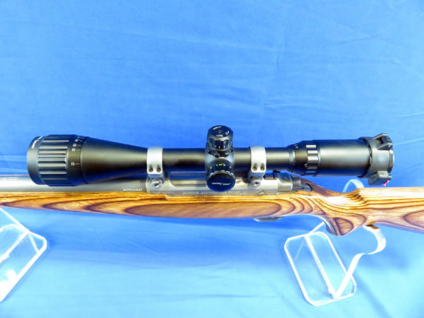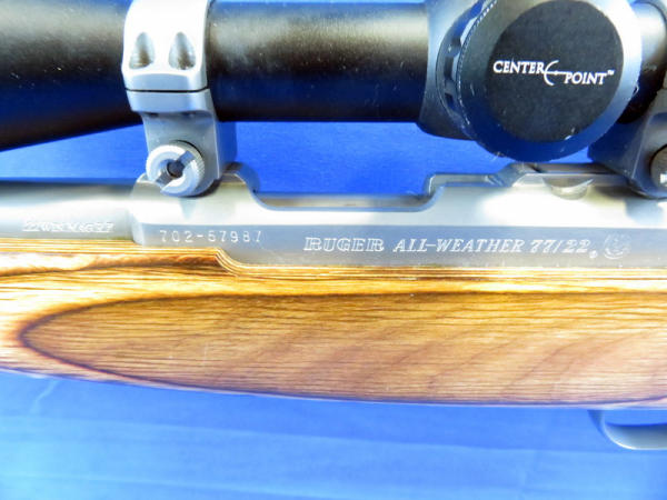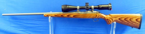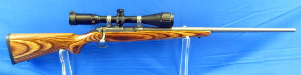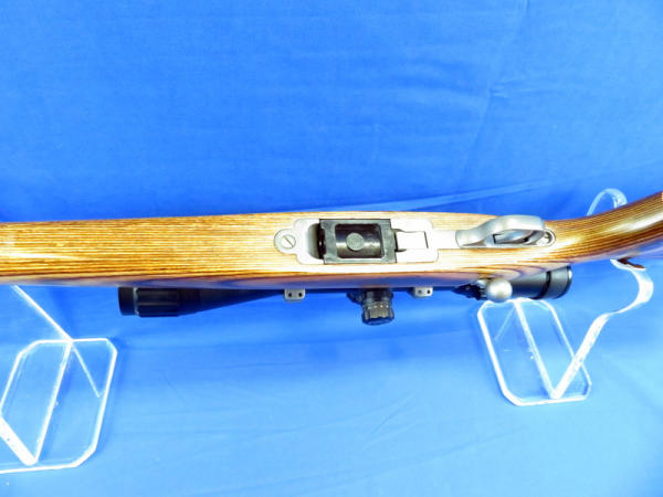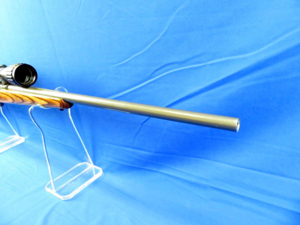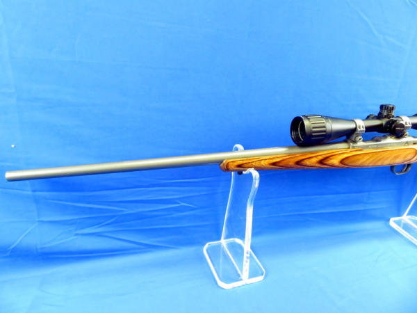 24" stainless barrel; wood grain laminate stock; near mint and appears unfired or shot very little; smooth action; Center Point scope is very clear; nice looking gun; SN#702-57987