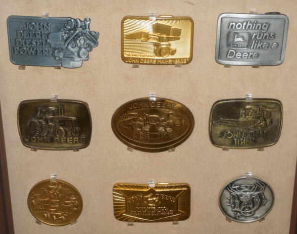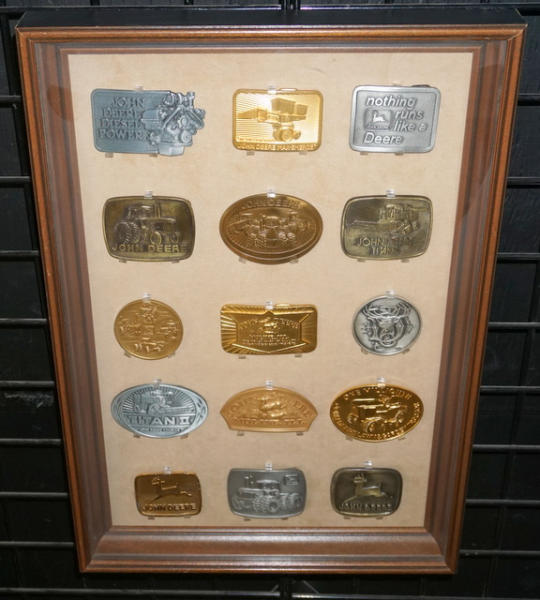 15 different buckles all framed shadow box style, the bottom left 2-leg buckle has casting rot, rest are good, 15"x22", no shipping, too fragile