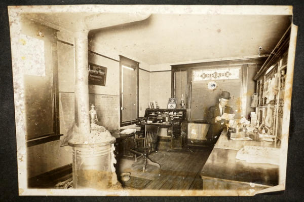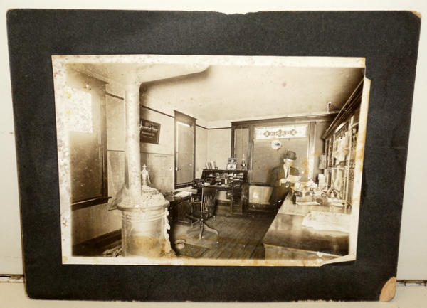 9"x7" card, heavy wear, shows parlor stove, stain glass window and more, not sure the town, but has a Benson County Map on the wall