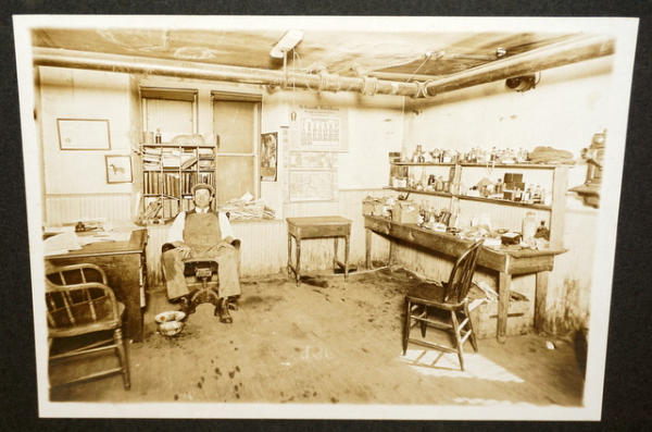 9.5"x8" card, shows a 1912 Calendar on the wall from Redfield, SD; so assuming it's in that part of the world; unique image with guy in the chair, spittoon covered in spit on the floor, and kind of a dump of an office! Normal wear