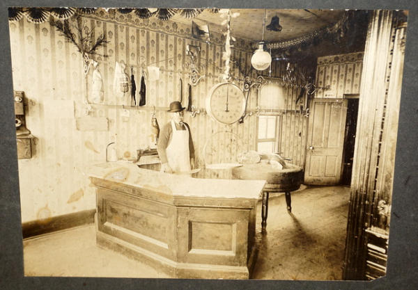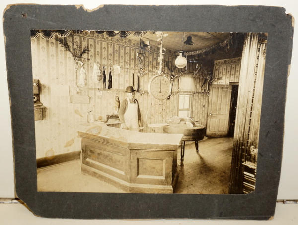 10"x8" card, quite a bit of wear, but great image of an early butcher shop, written in pencil on the back, "NABE" Spencer or Emmetsburg or Boone, IA