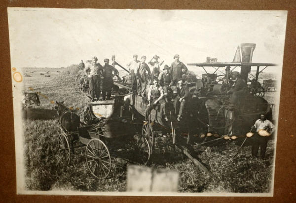 10"x8" card, some wear, several guys sitting on a water wagon, steam engine, but can't tell the brand