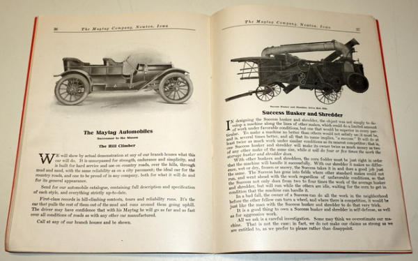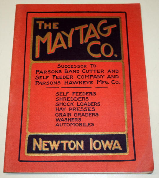 56 pages, pretty clean and nice, a few pages have had the red from the cover bleed through; shows the Maytag Automobile; must be one of Maytag's first catalogs, neat piece