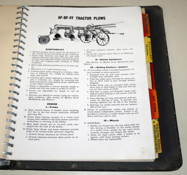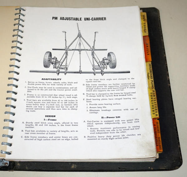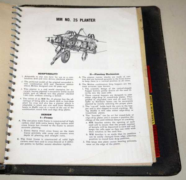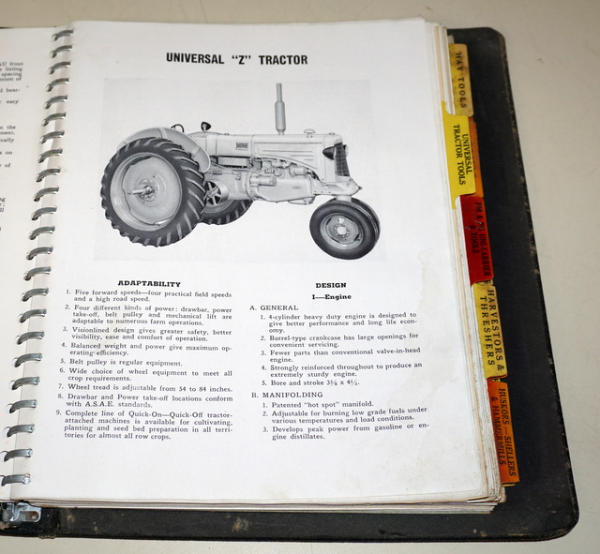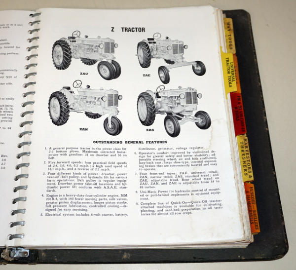 Binder has heavy wear, contents are pretty clean, includes R, Z, U & GTB Tractors plus lots of implements, about 1" thick