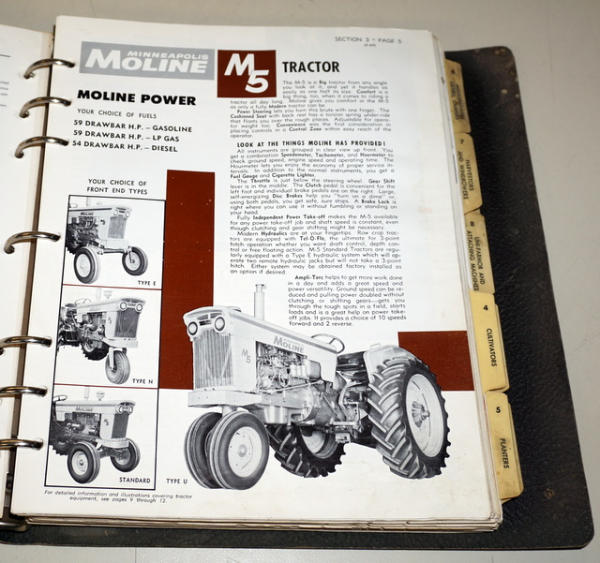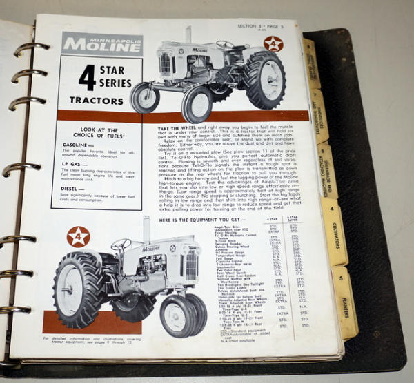 Binder has heavy wear, contents have some general wear, mainly Price lists, but includes some 1960's Tractor sales info, about 1" thick of material