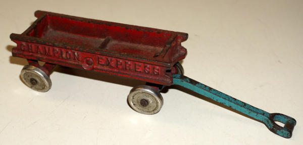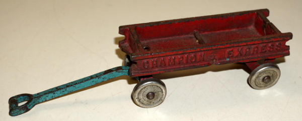 Wagon box is 4.5" long, original paint is about 75%, unusual piece of iron
