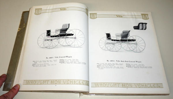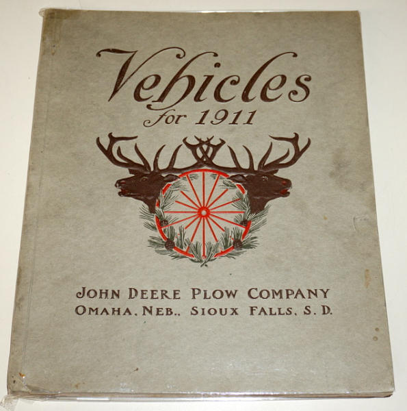 Large format, embossed cover, 140 pages! All buggies! On page 6, there is a piece cut out of the middle of the page, otherwise very clean and nice; very rare to find a buggy catalog this large! I think the best piece of JD buggy literature we have ever handled