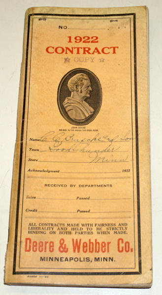 looks like a copy that was sent back to the dealer with a receipt of what they ordered, has a whole list inside of implements they ordered, some wear, but a unique piece of history; from Good Thunder, MN