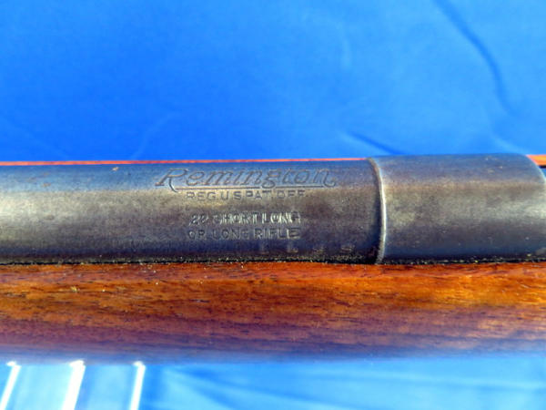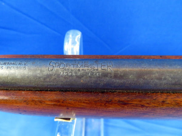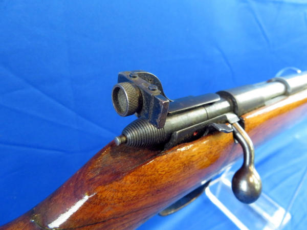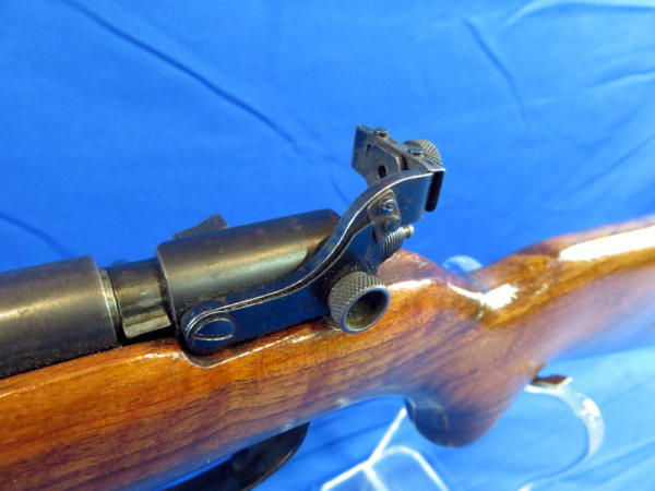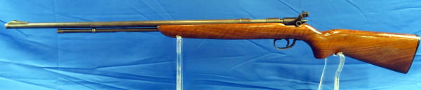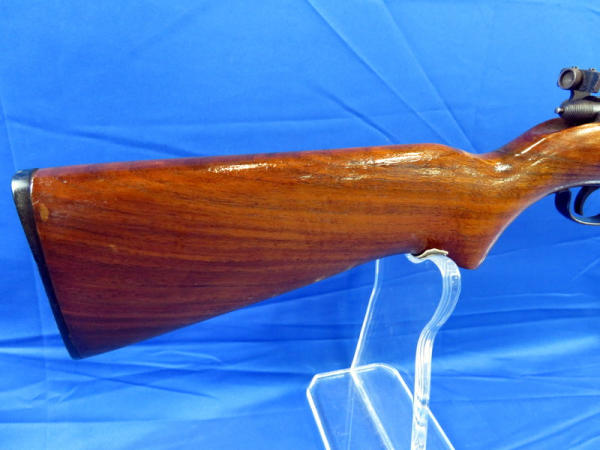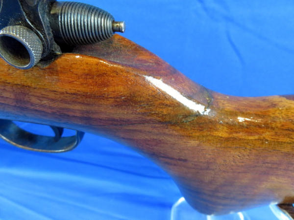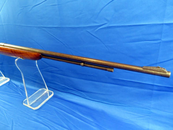 25" Bbl.; has rare factory rear peep sight; smooth action; stock has been nicely repaired and has good gloss; bluing is thin and spotting; no SN#