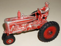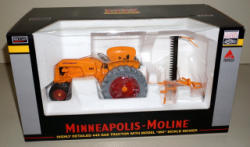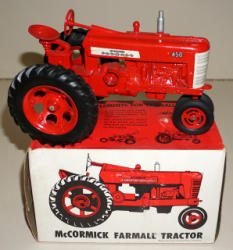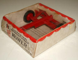 Never seen this piece before. IH Red mower, but solid red plastic rims and no decals from the factory; possibly a Massey Sample piece that was never put into production? Original bubble is good; 1-of-akind implement for your IH collection!