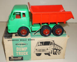 We have sold red ones, but never a red & green one that I can remember; toy is 1950's plastic and near mint condition; no cracks or warping; box is complete with some general wear and soiling, box rates 7.5 condition