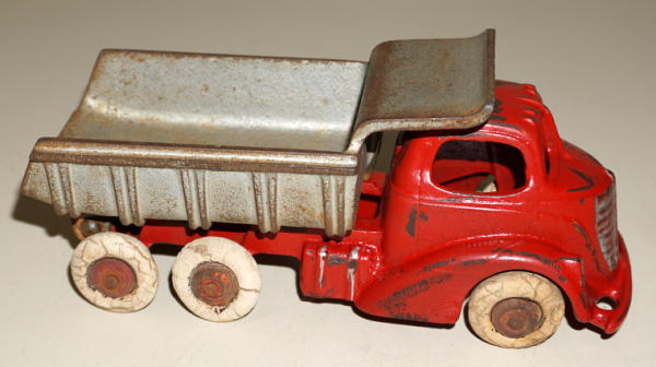 7.5" long, paint is about 75%, wheels are cracked & poor, the dump latch has been replace