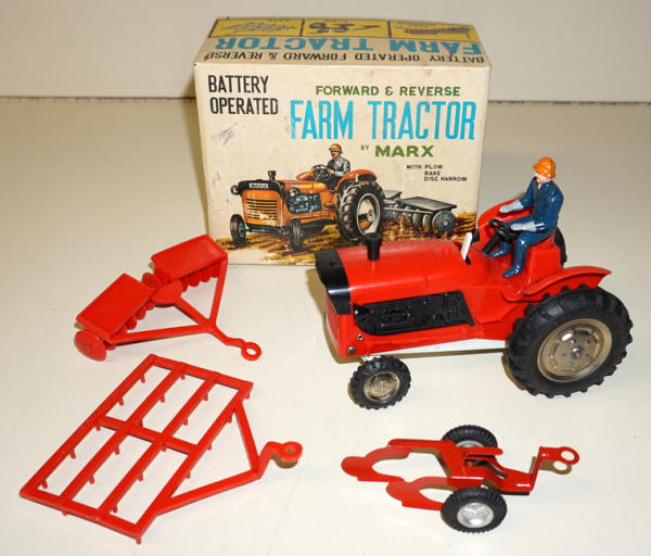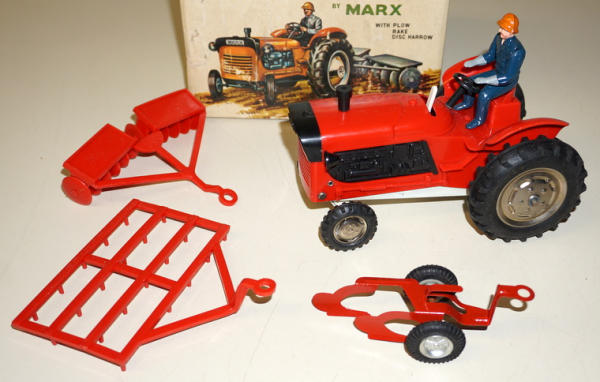 made in Hong Kong, tractor is 7" long and near mint, 2 implements are plastic, plow is metal, box is complete with some general wear, did not test