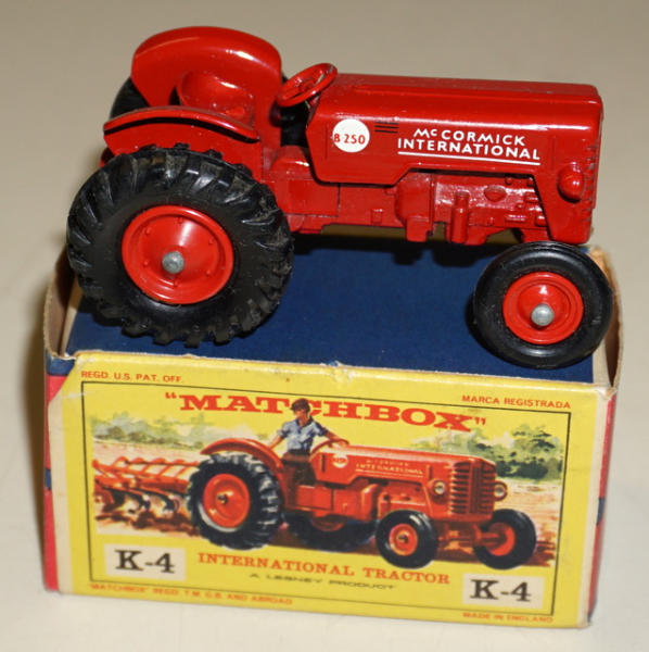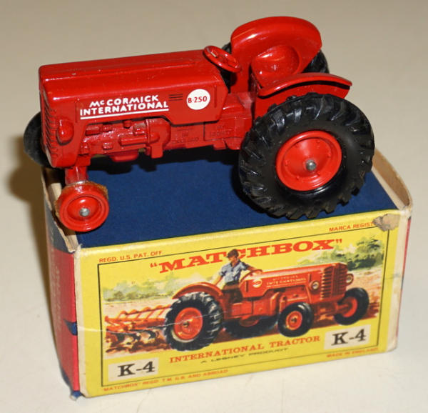 near mint toy, tires are loose, which is common with this toy due to age, box is nice with light wear, about 1/64th scale or a hair larger