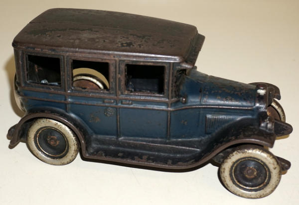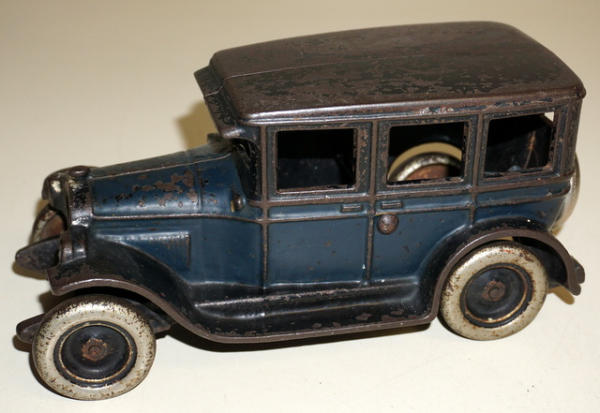 8.25" long, paint is about 60% with nearly no paint left on the cab, spare tire on the back is replacement, rest looks good