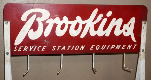 about 5' tall, 26" wide, 2- shelves with hooks, used with some general wear, would make a nice display for vintage brass gas pump handles, oil cans and service station equipment