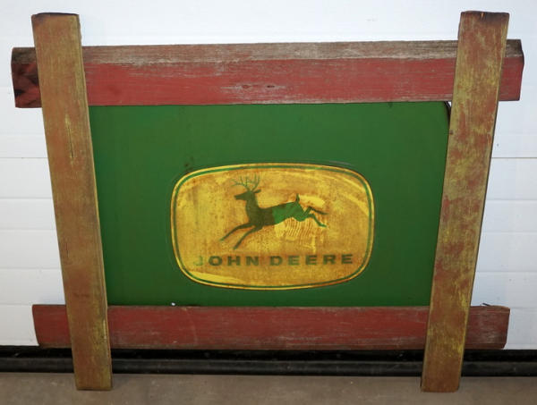 Piece of metal cut off a combine, in a barn wood frame, about 36"x36" overall; barn hanger