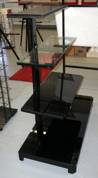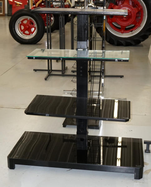 has 2 black glass shelves, one clear glass and one wood shelf; 52"T x 44" long