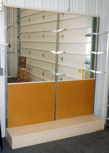 has 6-glass shelves; mirror & peg board back; 7'T x 6'L