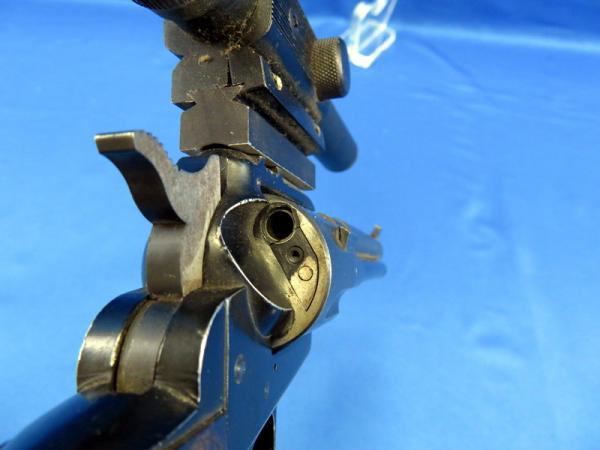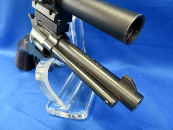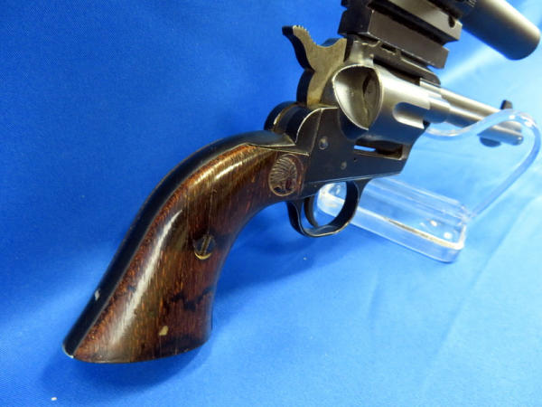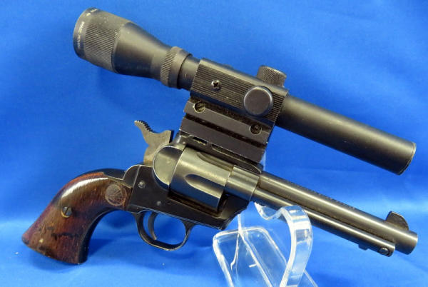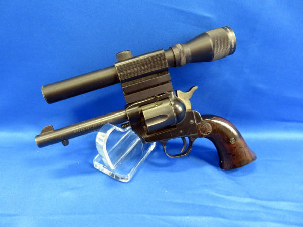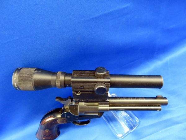 looks like a revolver, but is a single shot pistol; 4.25" Bbl.; Herter's 15x15 scope is clear but does have crack in lens; easy break action; factory wood grips; could use a cleaning; SN#15654