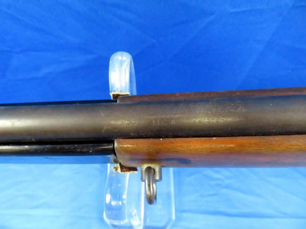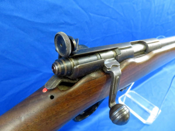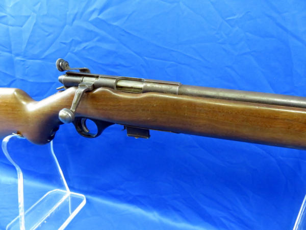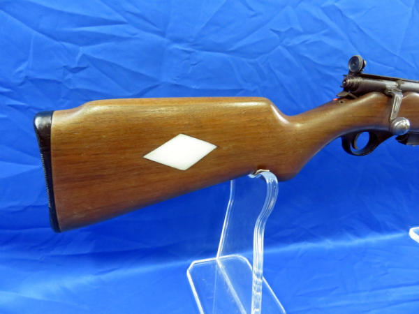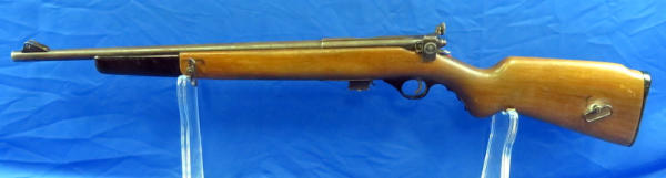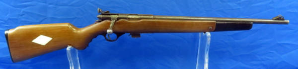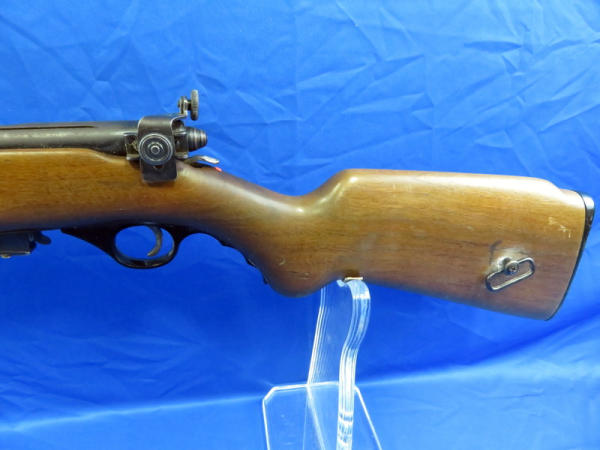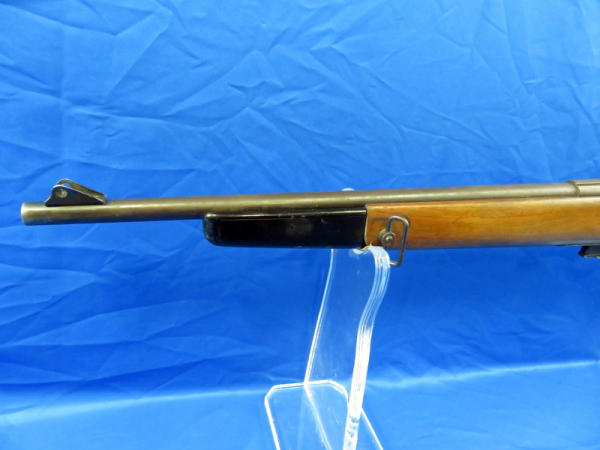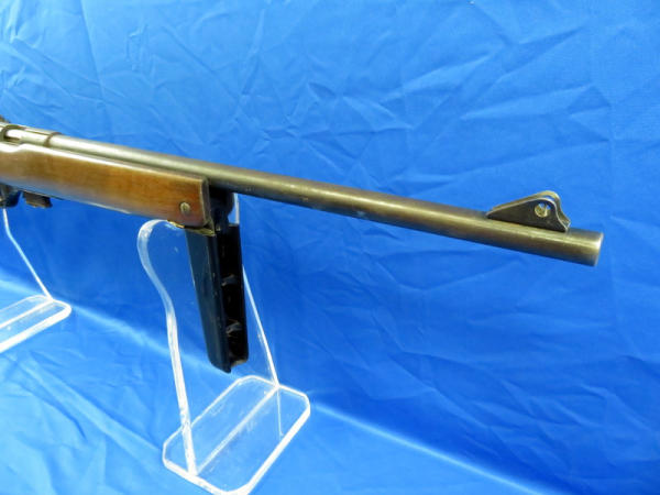 18" Bbl.; removable clip; has fold-down pistol grip forearm; bluing is spotting; rear peep sight; smooth action; wood is nice; no SN#
