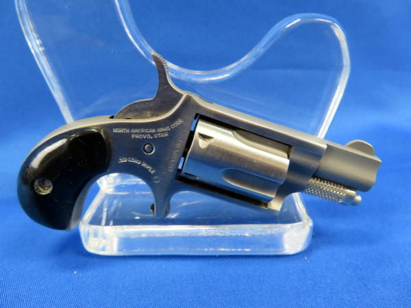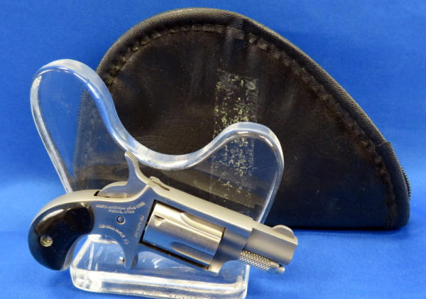 very small; 1-1/8" stainless barrel; spur trigger; 5-shot; like new condition, except for crack in one grip; SN#B76171; includes zippered case