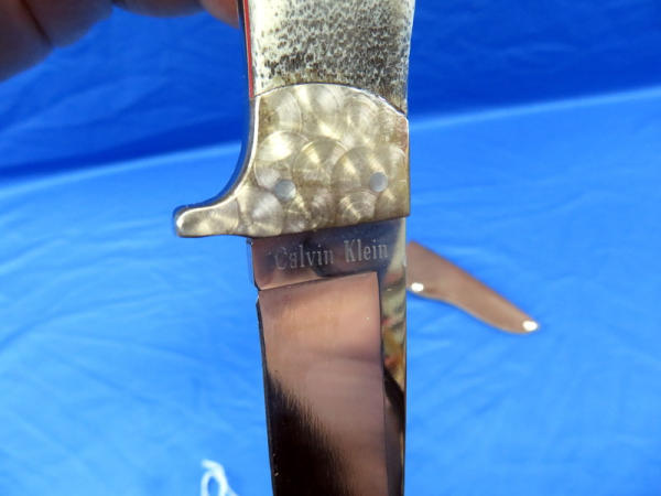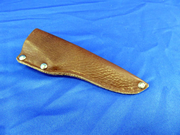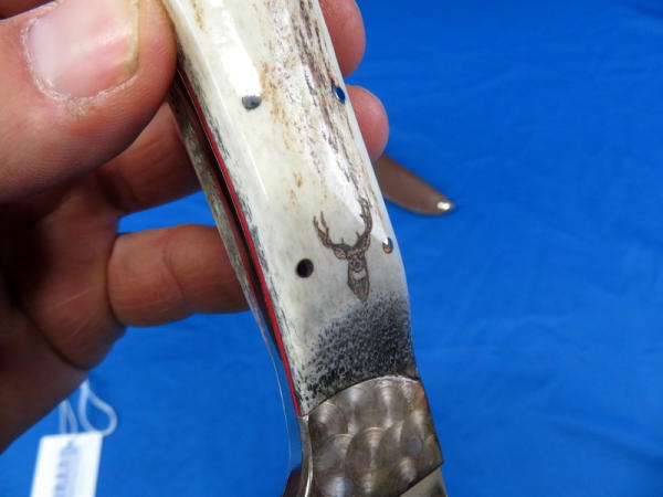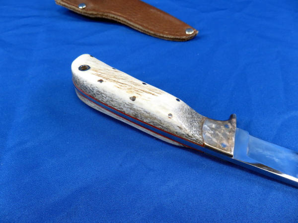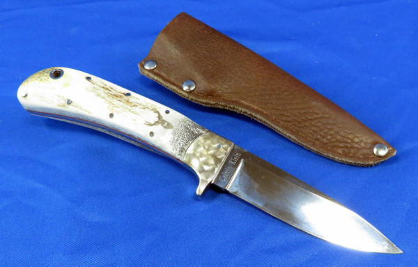 3.5" blade; believe to be Elk horn handle; has custom made leather sheath; great look