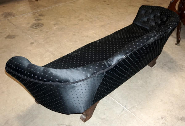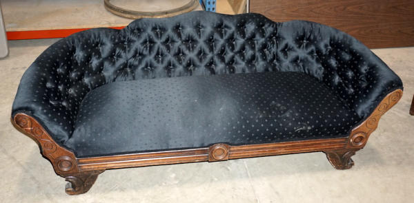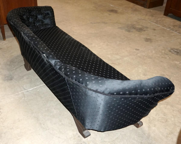 5' long, seat is just 12" tall, too big for a salesman sample, so I'm guess child's size, new material, wood looks original, carved sides