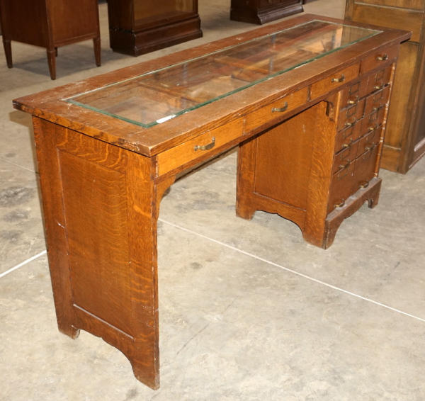 very unique, beveled glass top, several small drawers, 19"x60"x30", glass top has some chips in one corner, great display cabinet for smalls