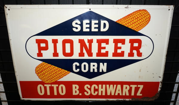 36"x24", great color, sat in the dirt and has paint loss and metal loss to the bottom right corner, still displays nice, rates 8 overall with damage noted