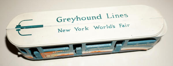 8.5" long; I've looked pretty hard at this bus and I think it is an exceptionally MINT original; decals are correct, colors are correct, screen printed printing on the top; nice enough for a box--wow!