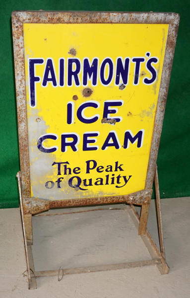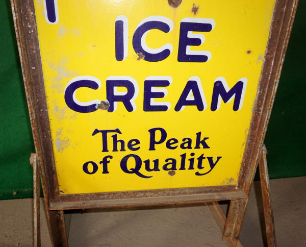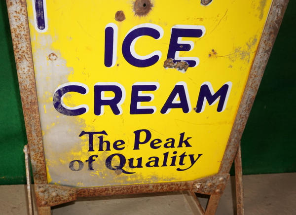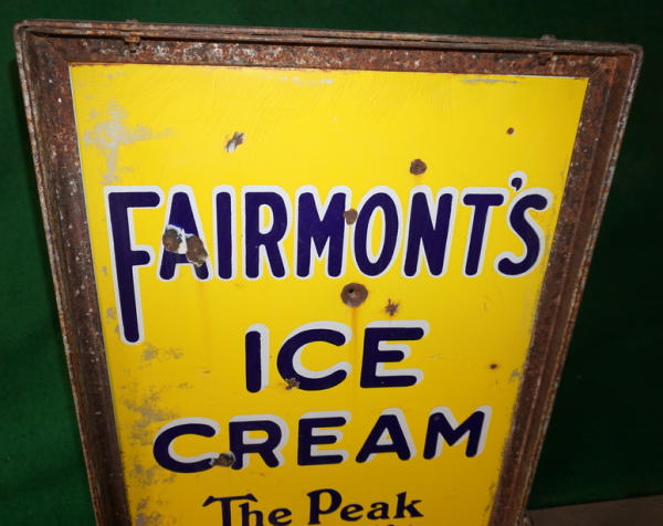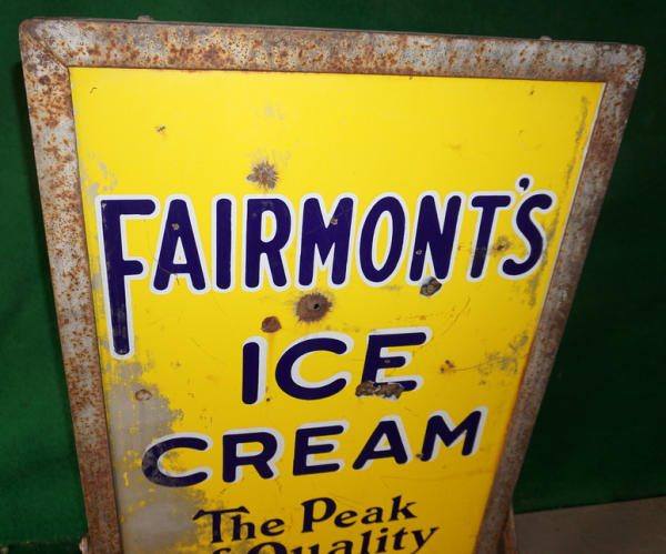 36" tall, 21" wide overall; has a bullet hole through the center and was painted over at one time, heavy chips and scratches, rates 7 condition overall, frame is original; very heavy sign